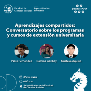 La especialidad de Economía invita a las y los estudiantes de la comunidad PUCP a un conversatorio enriquecedor con egresados destacados de los cursos y programas de extensión universitaria del Instituto Nacional de Defensa de la Competencia y de la Protección de la Propiedad Intelectual (Indecopi), Banco Central de Reserva del Perú (BCRP), Organismo Supervisor de Inversión Privada en Telecomunicaciones (Osiptel) y el Instituto Nacional de Estadística e Informática (INEI). En este evento, la y los ponentes compartirán sus experiencias sobre la preparación previa que realizaron, los desafíos que enfrentaron y las oportunidades que se les presentaron gracias al curso o programa de extensión.