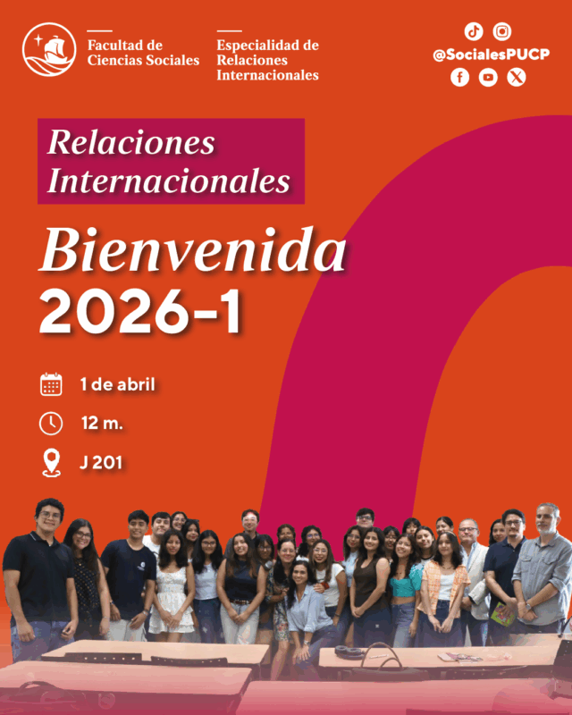 La Facultad de Ciencias Sociales invita a los cachimbos de la especialidad de Relaciones Internacionales a ser parte de la reunión de bienvenida organizada por la dirección. Aquí, podrán conversar con el equipo de la especialidad y resolver dudas para tener un excelente inicio de ciclo y paso por la Facultad.