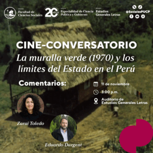 Como parte de las actividades conmemorativas por los 20 años de trayectoria, la especialidad de Ciencia Política y Gobierno, junto con la Oficina de Promoción Social y Actividades Culturales (OPROSAC) de Estudios Generales Letras, los invita a participar en el último cine-conversatorio del año.