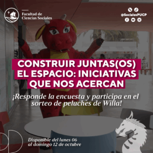 Con el fin de conocer la percepción de la comunidad de Ciencias Sociales, los invitamos a responder una encuesta dirigida a estudiantes, egresados, docentes, predocentes, personal administrativo de la Facultad, así como al personal de la Biblioteca Alberto Flores Galindo, CISEPA, Departamento de Ciencias Sociales, Departamento de Economía y el personal de mantenimiento.