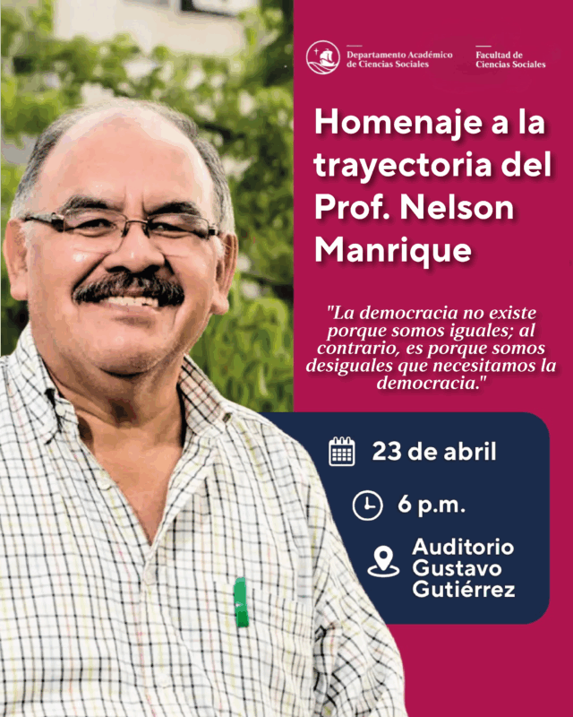 La Facultad de Ciencias Sociales y el Departamento de Ciencias Sociales organizan un homenaje en reconocimiento a la trayectoria de Nelson Manrique, destacado historiador y sociólogo peruano, cuyas investigaciones han contribuido significativamente a la comprensión de los procesos sociales, políticos y culturales del país.