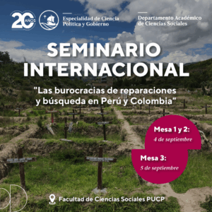 El Departamento de Ciencias Sociales de la Pontificia Universidad Católica del Perú (PUCP) y la especialidad de Ciencia Política y Gobierno organiza el Seminario Internacional “Las burocracias de reparaciones y búsqueda en Perú y Colombia”, un espacio de reflexión crítica sobre los procesos institucionales que sostienen las políticas públicas de reparación, búsqueda y memoria en ambos países, a realizarse los días 4 y 5 de septiembre de 2025.