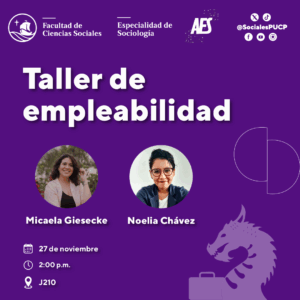 El próximo jueves 27 de noviembre, de 2:00 p.m. a 3:00 p.m., se llevará a cabo el «Taller de empleabilidad» en el aula J210, dirigido a las y los estudiantes de Sociología PUCP.